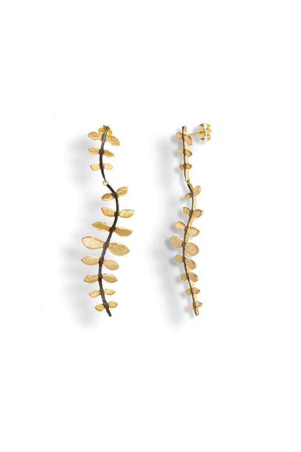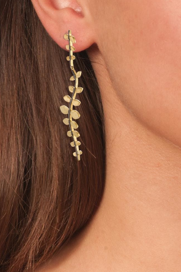 Handmade gold plated silver long dangle earrings leaves with a black plated stem. Make an elegant impression with these stunning gold plated silver long dangle earrings leaves with a black stem; wear this handmade piece of jewellery day and night to give a classy spirit to your look.