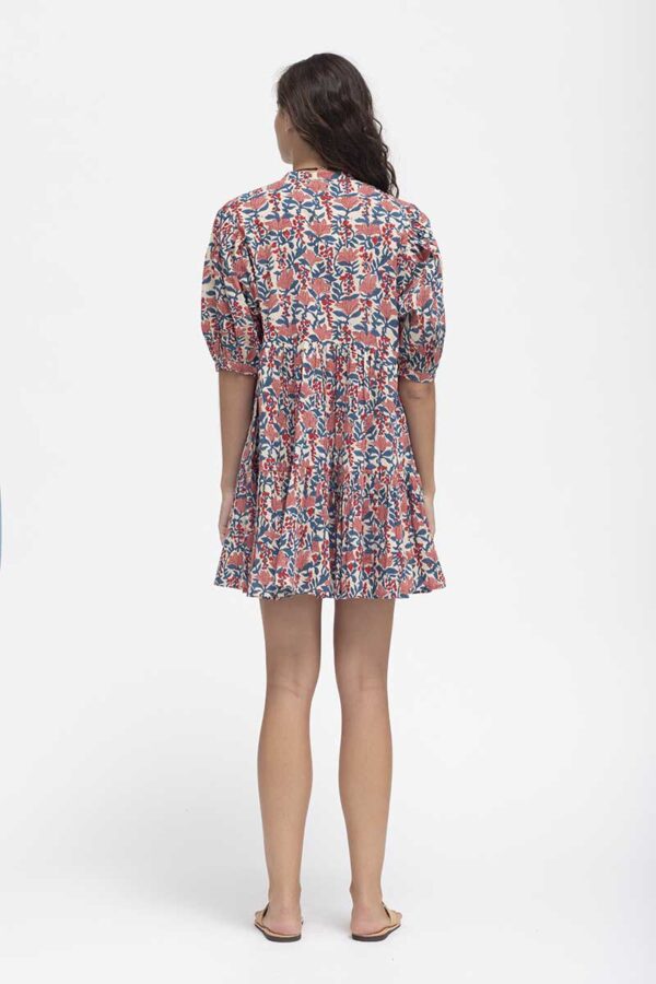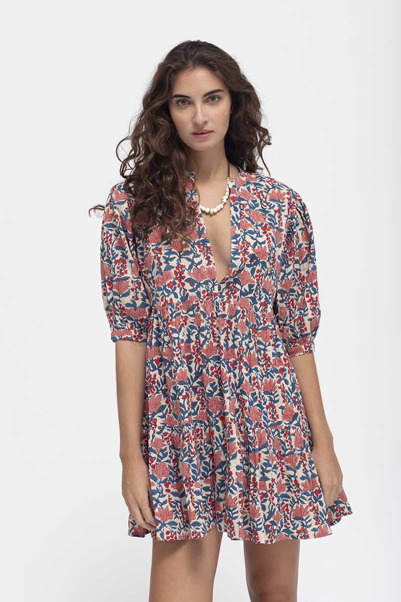 Summer short dolman dress in allover in allover Block Printed patterns with sleeves andbuttons halfway down, in soft 100% cotton voile fabric. Block Printed fabrics are made by hand in the old traditional way and thus each piece is unique.