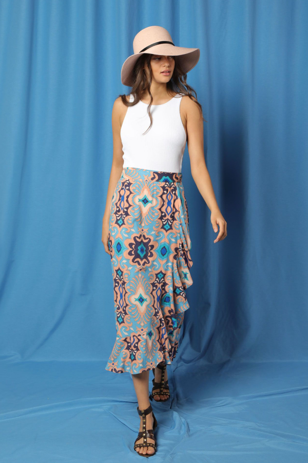 Maxi skirt with geometric print. Adjustable side tie and ruffle hem.